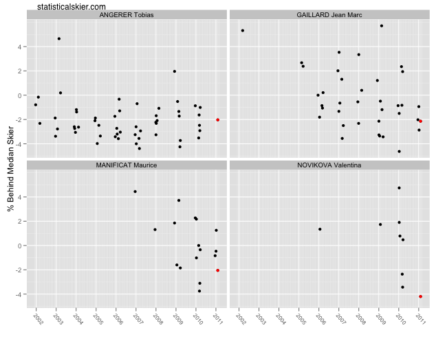 I’m using the percent behind the median skier, and I’ve only plotted major international races (WC, OWG, WSC, TDS). The red is obviously the Rybinsk result. For the three men, this makes their results look somewhat less impressive. Not bad, of course, but probably not quite as good as they might have seemed from just glancing at the results.
