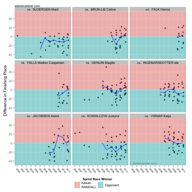 This shows the difference in finishing place between Randall and several top sprinters when they’ve raced head-to-head in sprint races over time. Values above zero mean Randall won and vice versa. Some of the trends are particularly interesting…