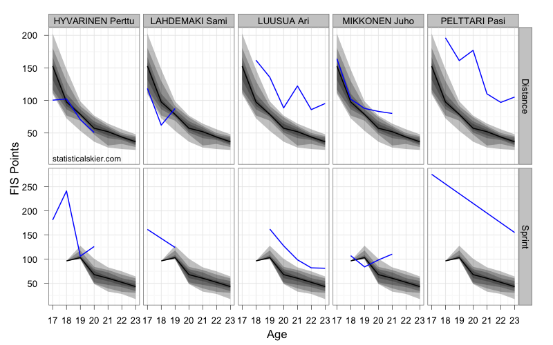 Obviously, one wants to be at or below the shaded region, ideally. But those shaded regions don’t represent everyone who was ever successful, so it’s certainly possible to buck the trend and be a late bloomer. It just happens less frequently. Perttu Hyvarinen certainly seems promising. Sami Lahdemaki does as well, despite a slight uptick in his results last season.